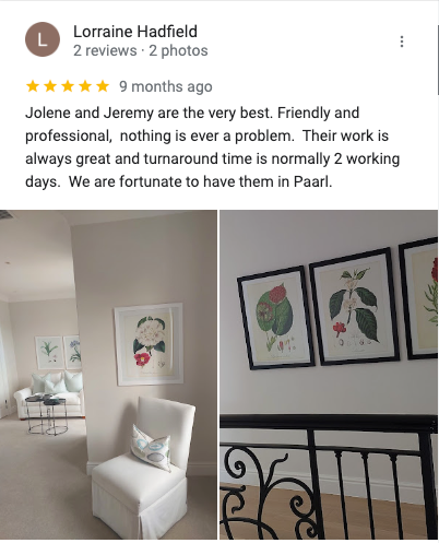 Jolene and Jeremy are the very best. Friendly and professional, nothing is ever a problem. Their work is always great and turnaround time is normally 2 working days. We are fortunate to have them in Paarl.